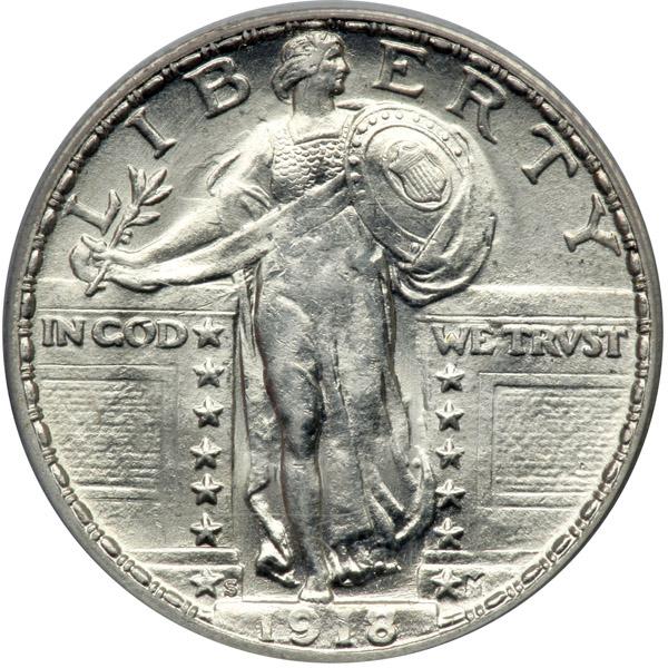 1918-S Liberty Standing Quarter Dollar. PCGS graded MS-64 Full Head. A nice white coin. Aesthetically appealing, a handsome full head bristling with bright mint bloom and without toning. This is an otherwise strongly struck example, with nice detail to all the important high points, with the possible exception of these regions (standard for the issue): Liberty's midsection and the eagle's breast, which comprise the two highest areas of the design and so can (and often do) fail to fill the recesses in the die in their entirety. 1918-S isn't a date to be sneezed at in this condition since months, possibly years may go by between offerings. Pop 88; 40 finer, 34 in 65, 6 in 66 (PCGS # 5725) .