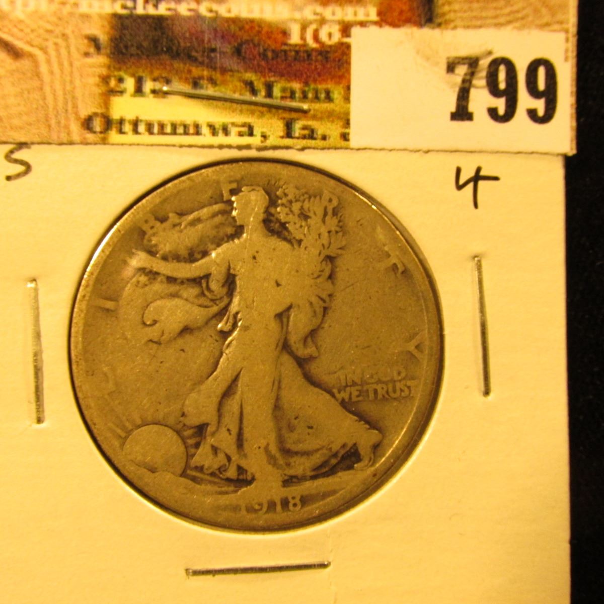 1918 S U.S. Walking Liberty Half Dollar, Good.