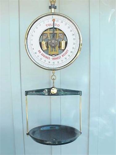 1918 Toledo style 1605 F open face hanging produce scale. Professionally restored.
