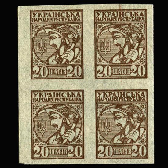 1918 Ukraine 20 Shahiv Postage Stamp Imperforate Mint Block of 4 (STM-0360)