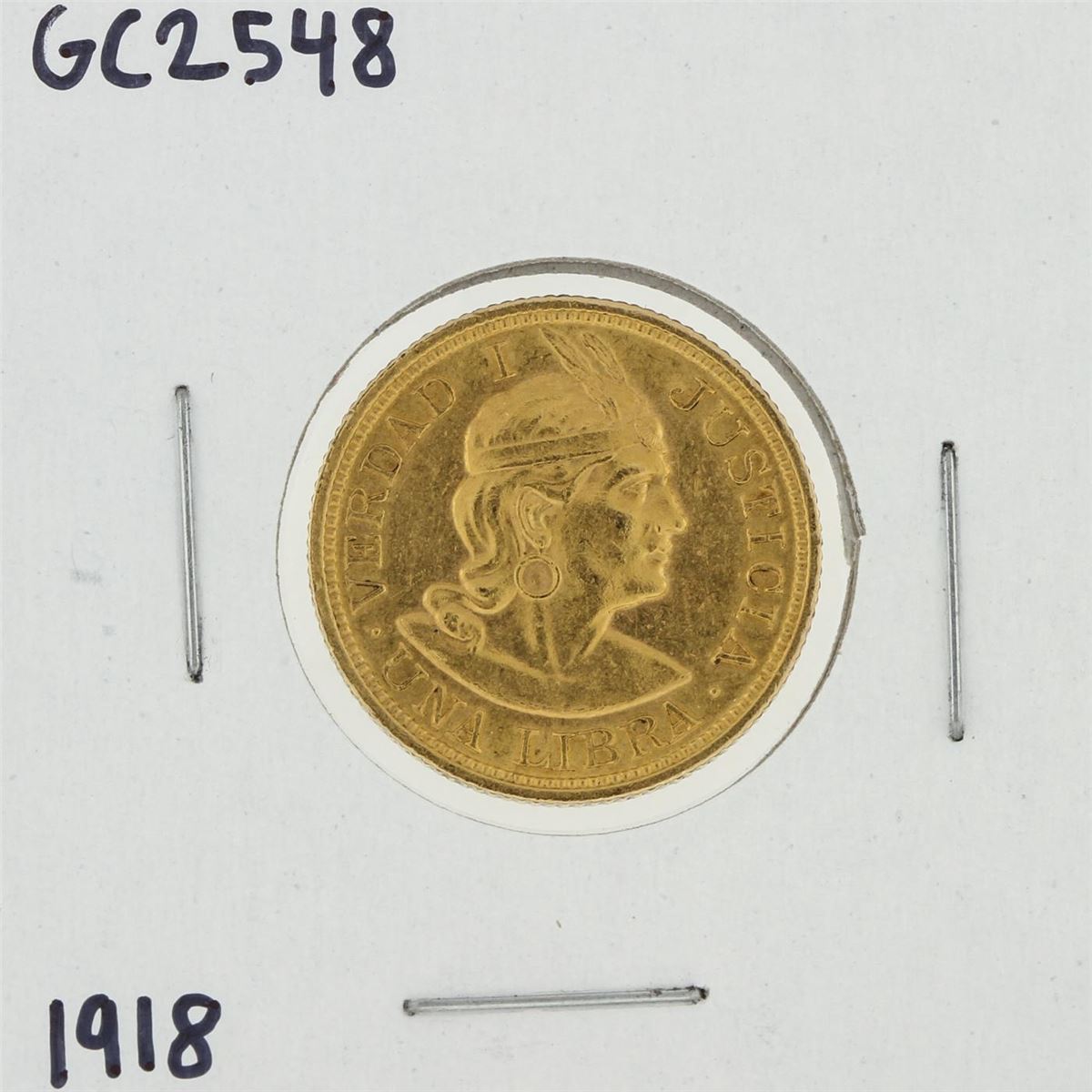 One 1918 Una Libra Gold Coin. Total weight if coin is 7.9 grams.