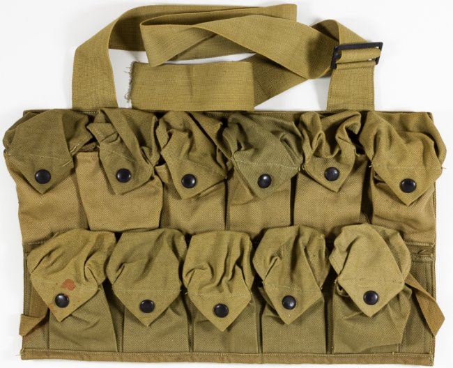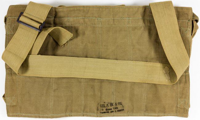 Uncommon U.S.-issued green canvas grenade carrying apron, 18" x 10 1/2" with ten pouches with snap closures, neck strap and two chest straps, unissued. Verso is stamped by maker "George P. Doe[?] & Co. June 1918" with inspector's name. Very good.