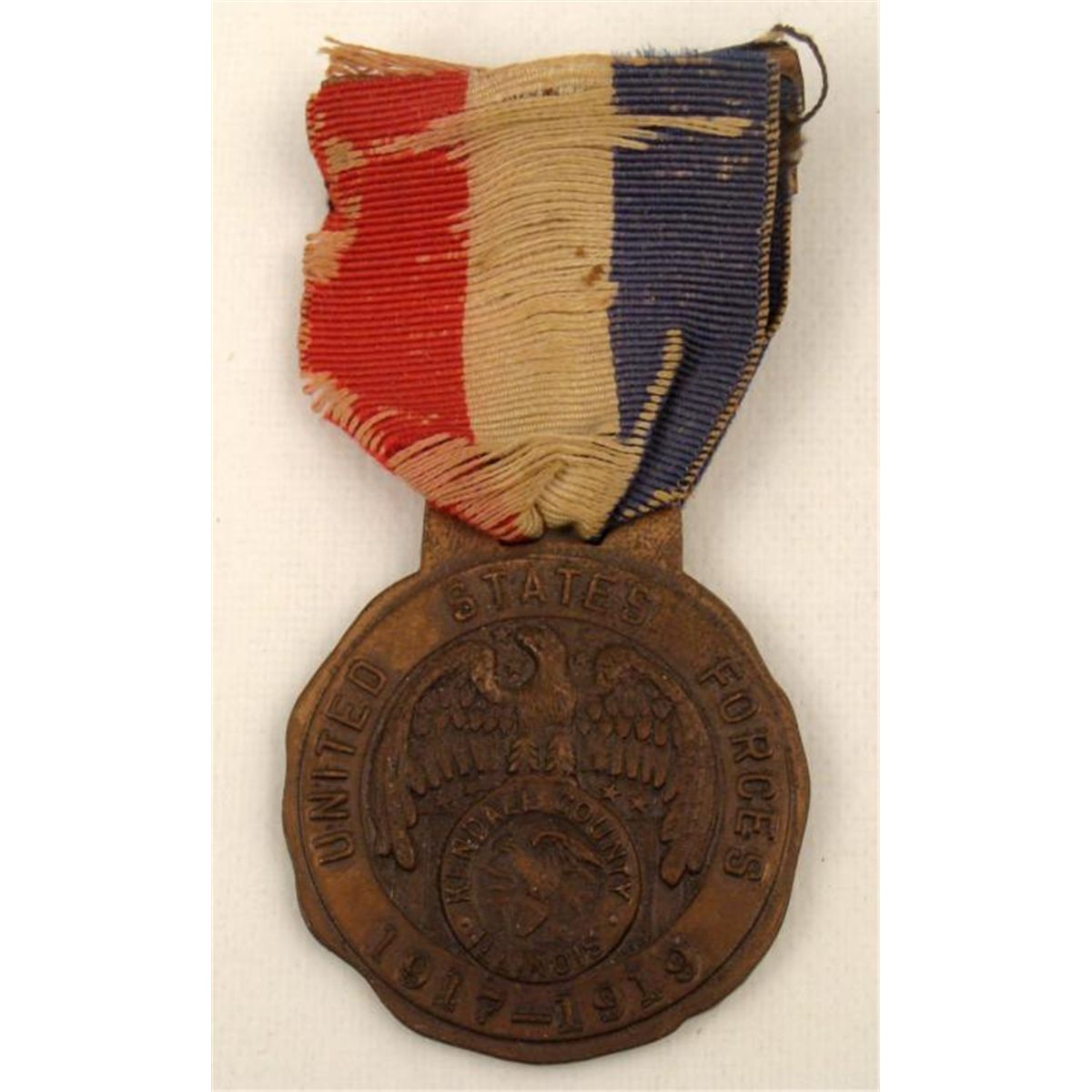 THIS IS A WWI RECOGNITION MEDAL & RIBBON FOR A MILITARY MAN FROM KENDALL COUNTY ILLINOIS, 1918.