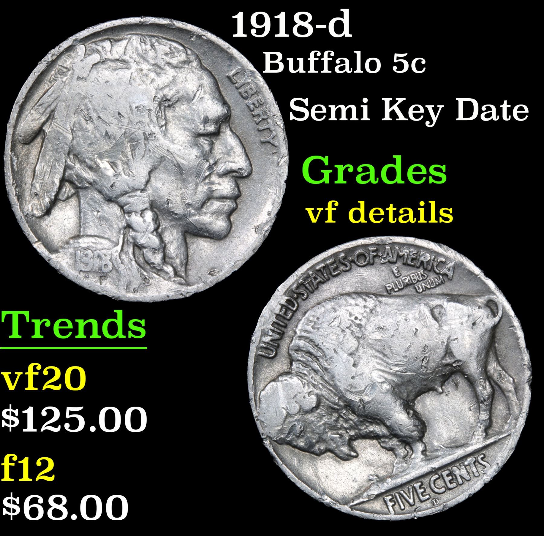 1918-d Semi Key Date . Buffalo Nickel 5c Grades vf details.