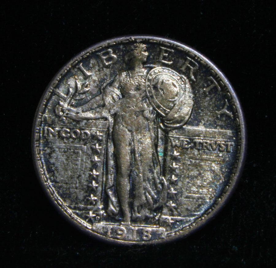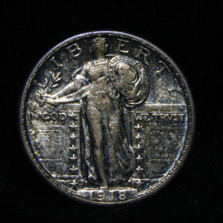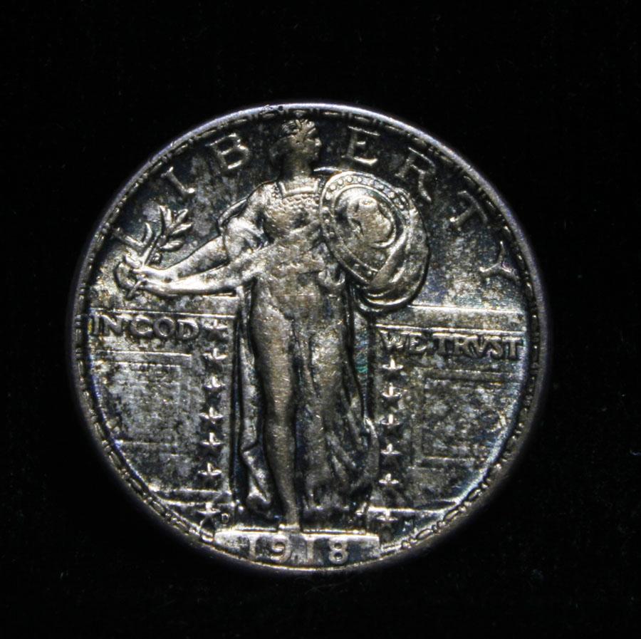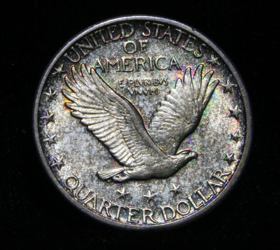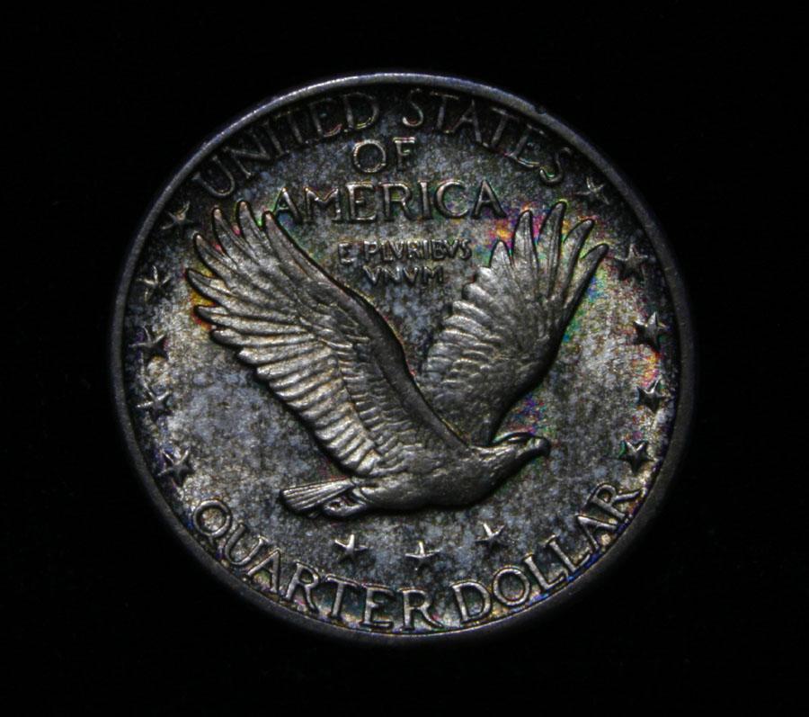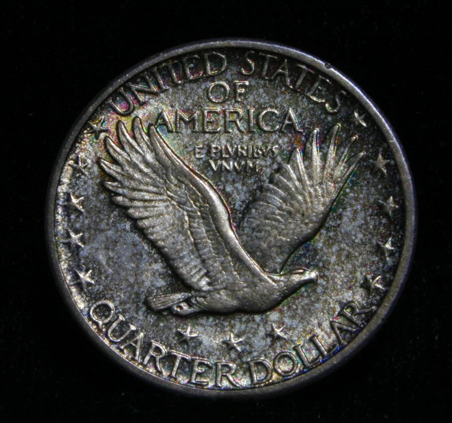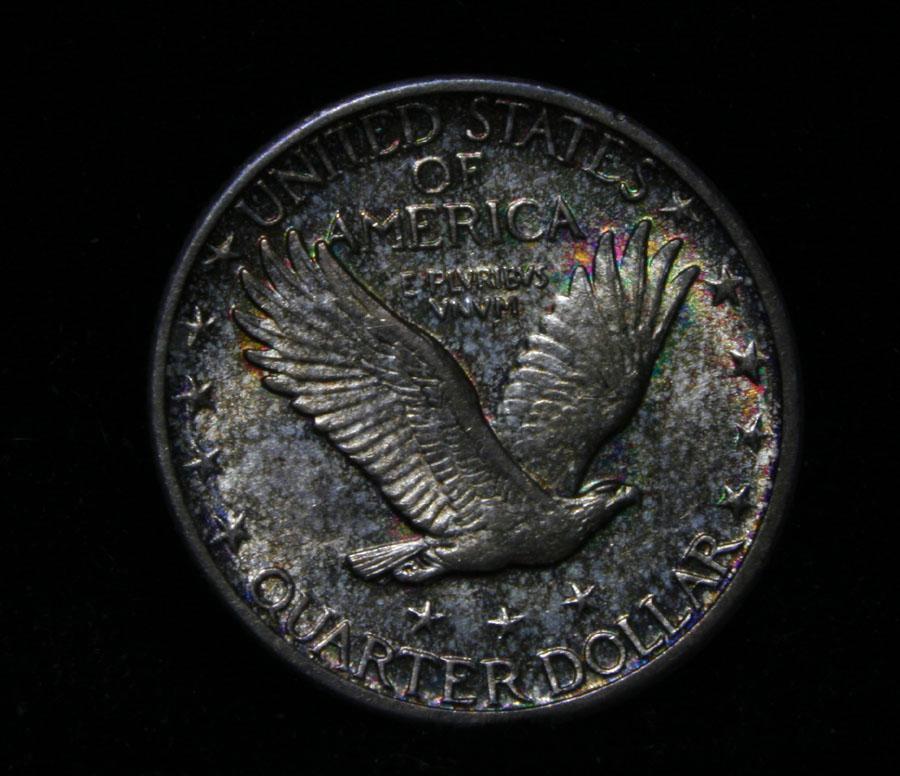 A nice Toned All Original Never Dipped in its 92 year history Standing Liberty Quarter, with A full Head, full hairline, ear and three feathers, it has it all. The shield is almost full but a rivet or two are weak. Great All Original Coin. Coin World's Coin Values lists ms64FH at $2000 and The Wholesale Greysheet lists does not list ms64 FH, but ms65 regular is $1000 and ms65 FH is $3400, so since ms64 Regular is $600, I feel ms64 FH wholesale would be $1500. Estimated Value $1500