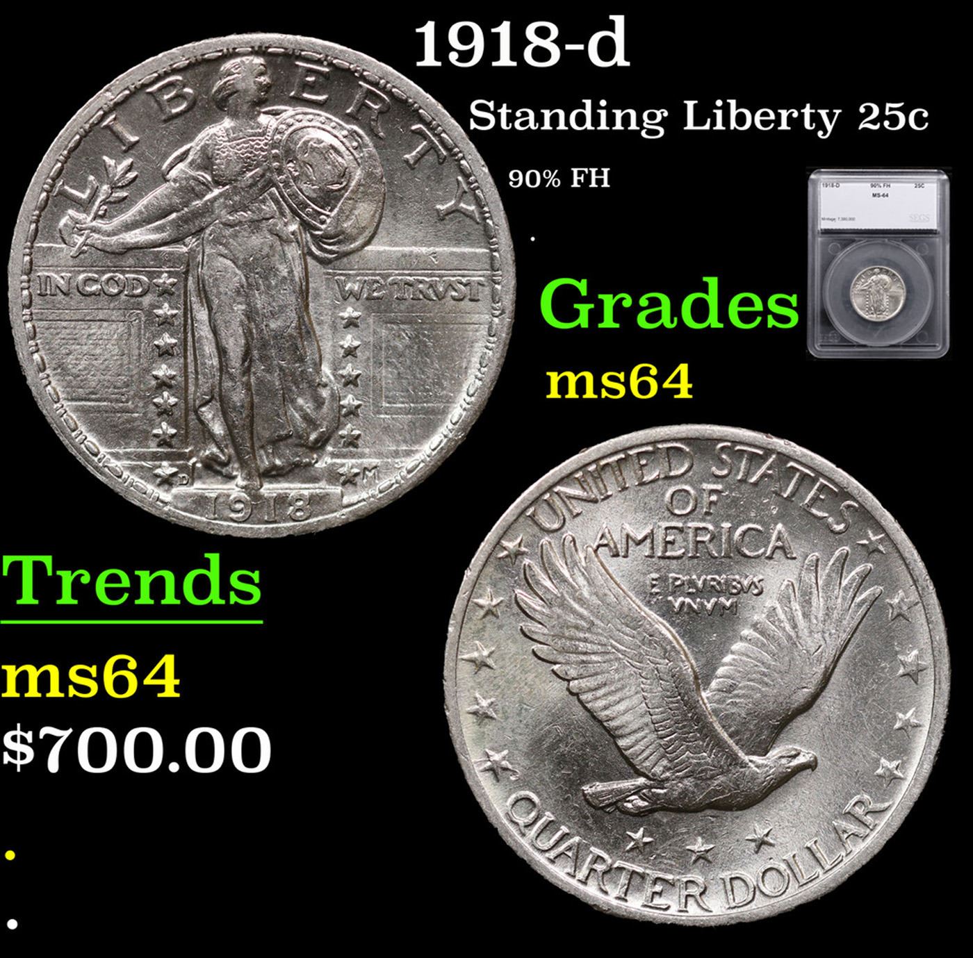 1918-d Standing Liberty Quarter 25c Graded ms64 By SEGS.