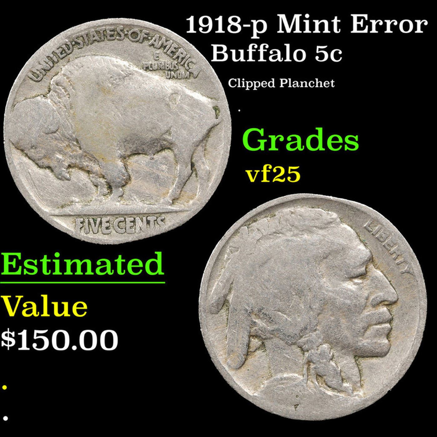 1918-p Mint Error Buffalo Nickel 5c Grades vf+.