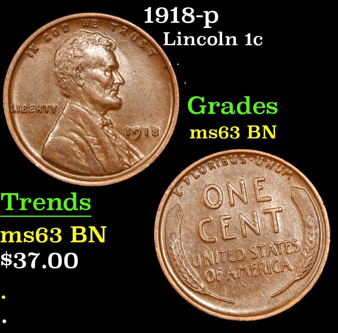 1918-p Lincoln Cent 1c Grades Select Unc BN. With an original mintage of over 288 million pieces, PCGS estimates that only 1200 remain in ms65 or better.