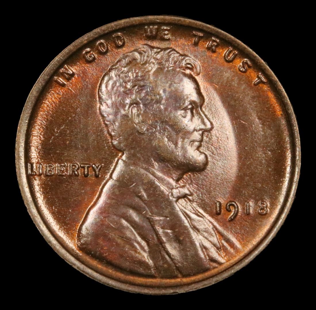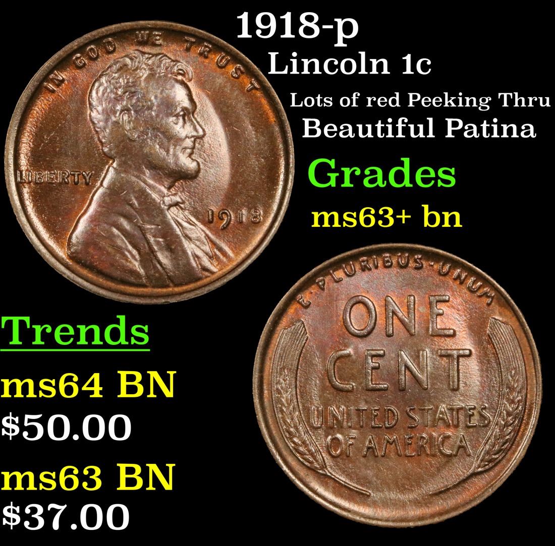 1918-p Lots of red Peeking Thru Beautiful Patina Lincoln Cent 1c Grades Select+ Unc BN. With an original mintage of over 288 million pieces, PCGS estimates that only 1200 remain in ms65 or better.