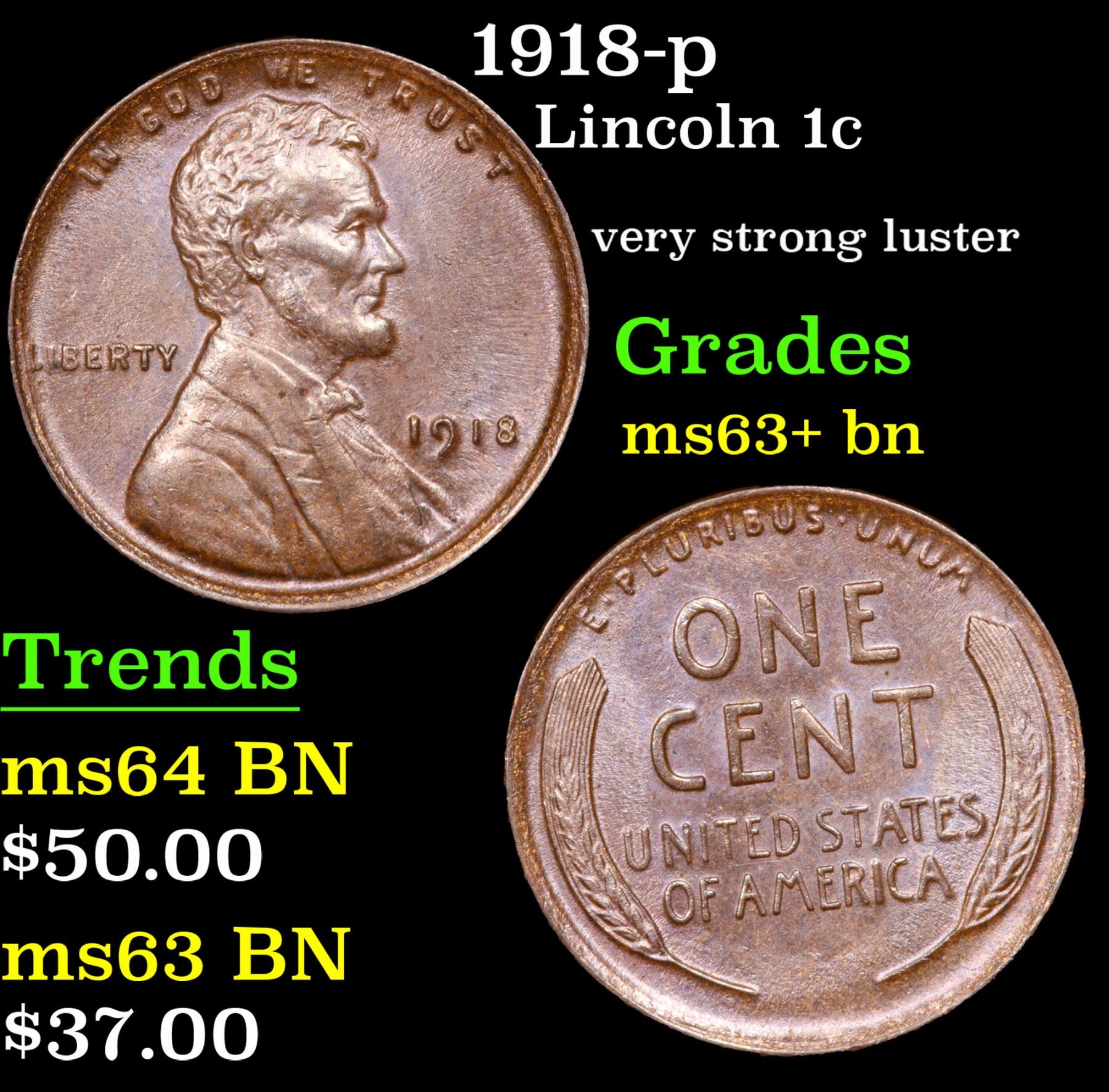 1918-p very strong luster . Lincoln Cent 1c Grades Select+ Unc BN. With an original mintage of over 288 million pieces, PCGS estimates that only 1200 remain in ms65 or better.