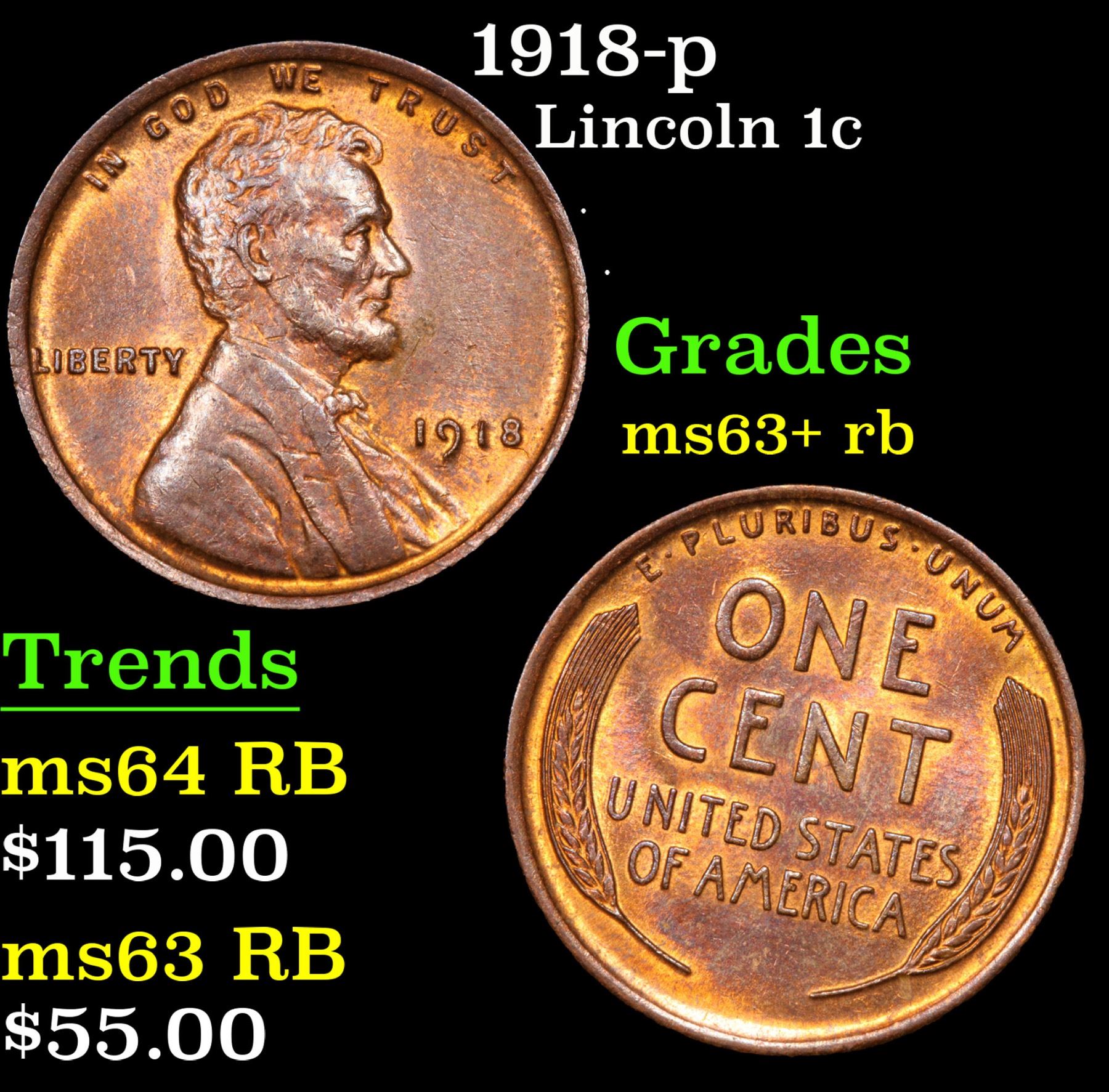 1918-p . . Lincoln Cent 1c Grades Select+ Unc RB. With an original mintage of over 288 million pieces, PCGS estimates that only 1200 remain in ms65 or better.