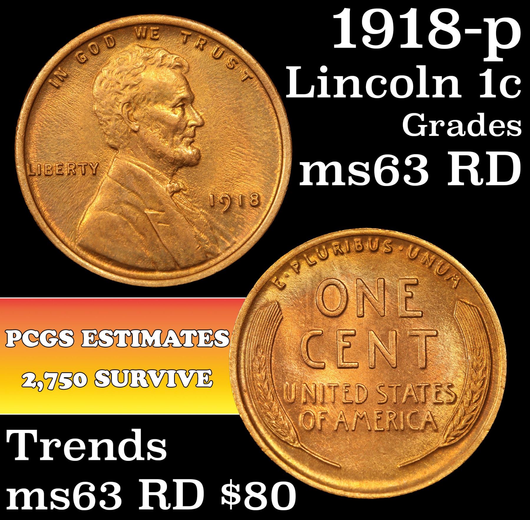 1918-p Lincoln Cent 1c Grades Select Unc RD. With an original mintage of over 288 million pieces, PCGS estimates that only 1200 remain in ms65 or better.