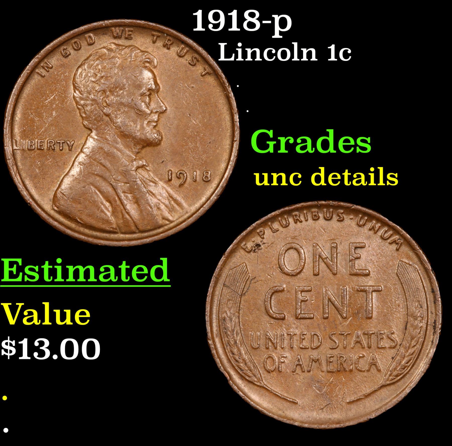 1918-p Lincoln Cent 1c Grades Unc Details.