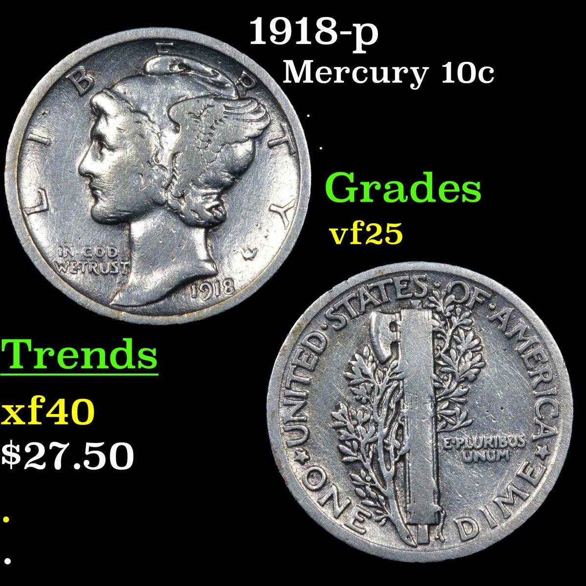 1918-p . . Mercury Dime 10c Grades vf+.