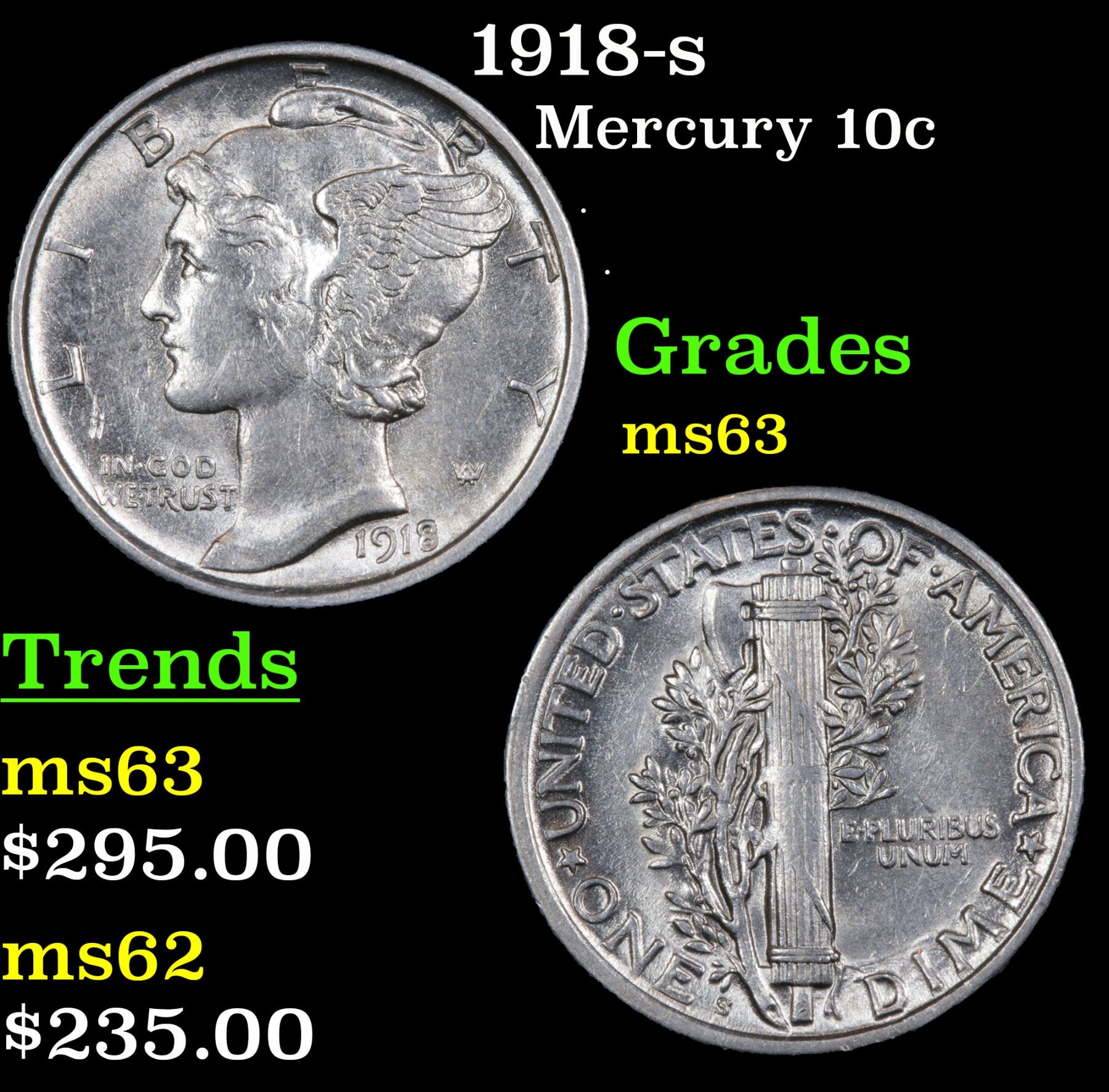 1918-s Mercury Dime 10c Grades Select Unc.