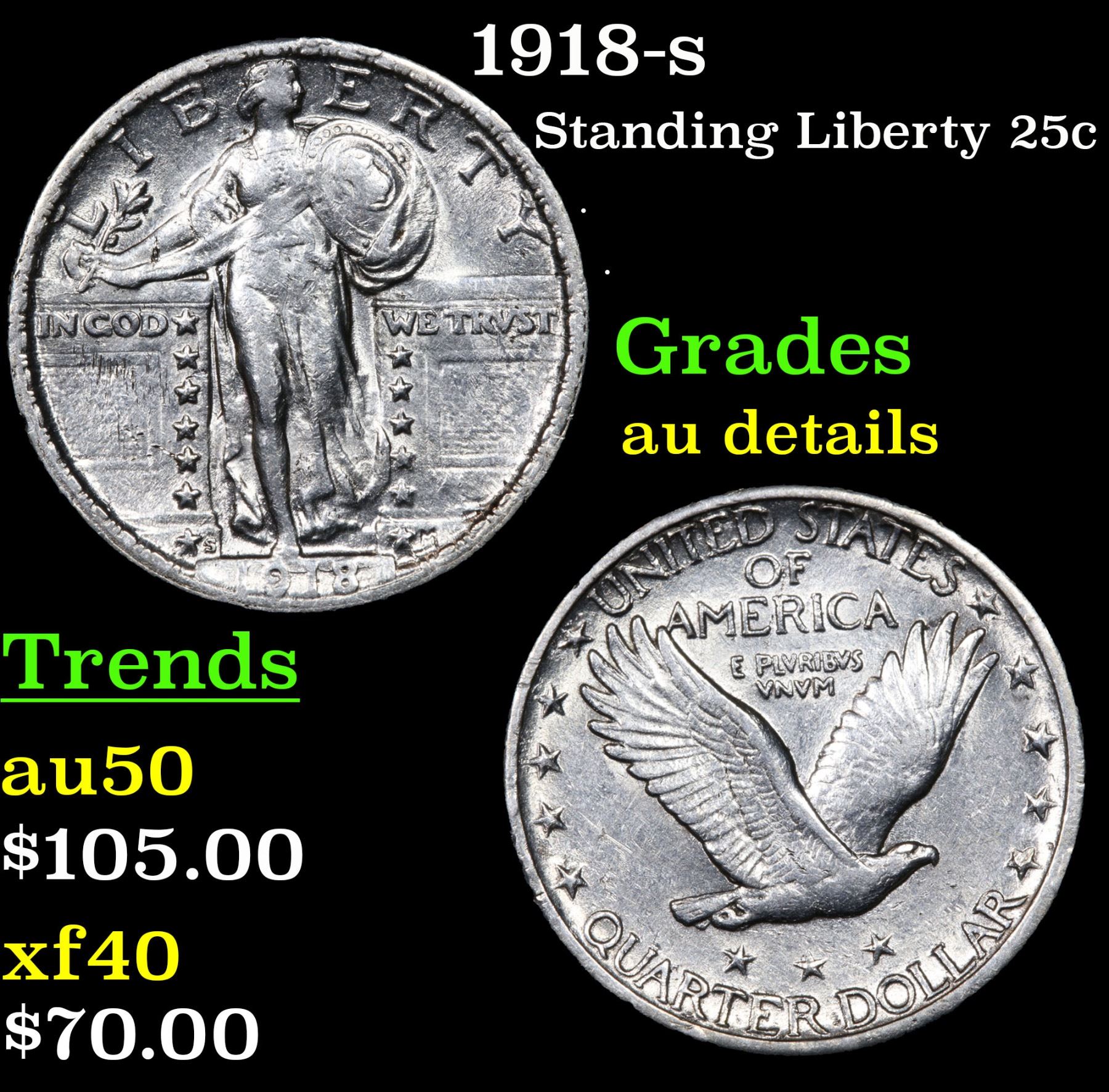 1918-s . . Standing Liberty Quarter 25c Grades AU Details.