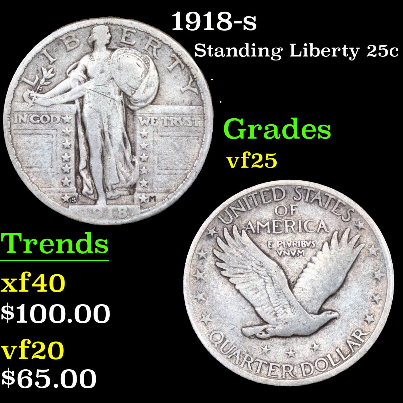 1918-s Standing Liberty Quarter 25c Grades vf+.
