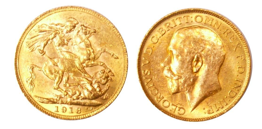 1918c Gold Sov. AU50, some lustre.