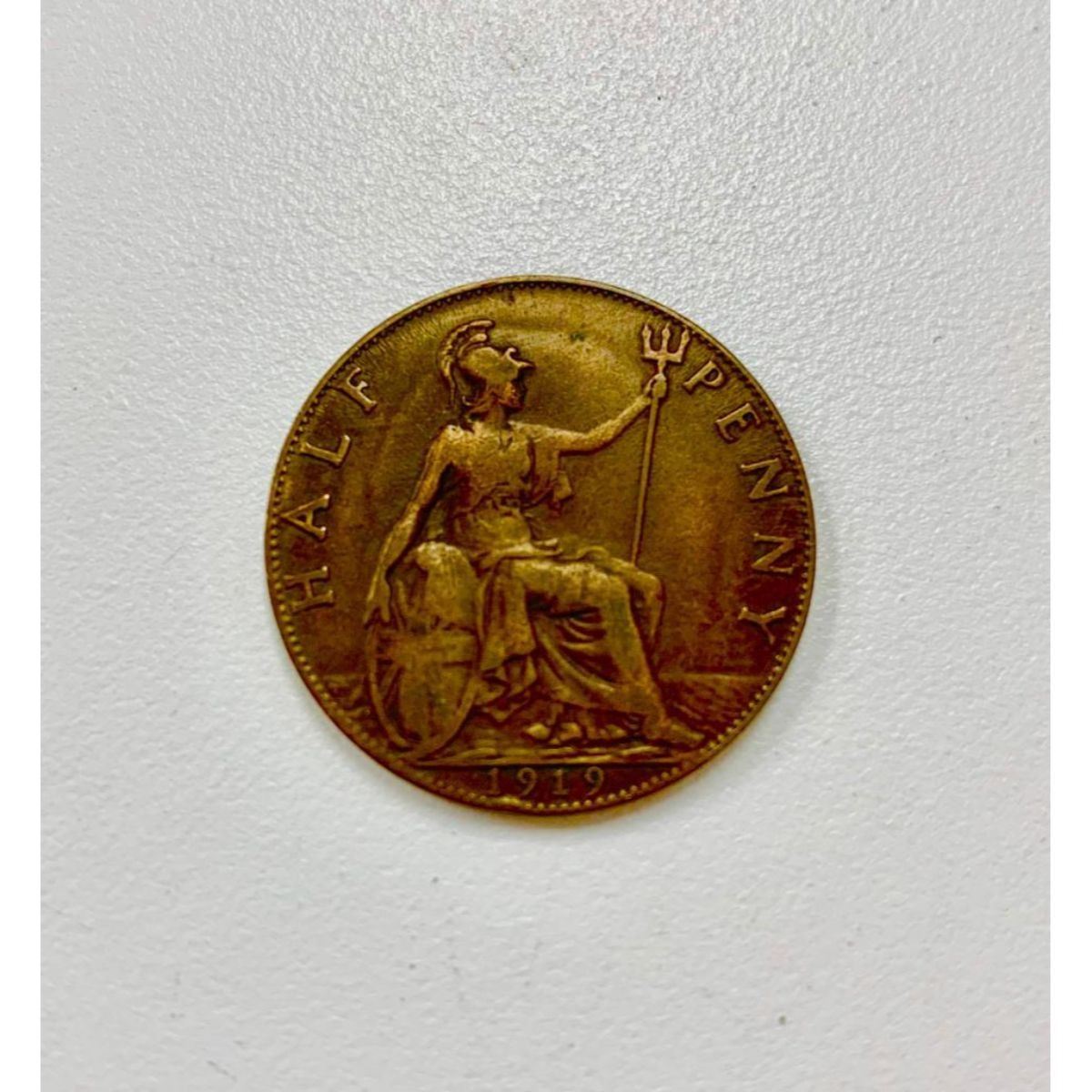 Obverse Uncrowned portrait of King George V facing left, legend around. Lettering: GEORGIVS V DEI GRA:BRITT:OMN:REX FID:DEF:IND:IMP Translation: George the Fifth by the Grace of God King of all the Britains Defender of the Faith Emperor of India Engraver: Edgar Bertram MacKennal Reverse Seated figure of Britannia right, trident in left hand, shield bearing the Union flag in right, denomination around, date in exergue, sea behind Lettering: HALF PENNY 1919 Engraver: Leonard Charles Wyon Edge Plain Specifications Country: United Kingdom King: George V (1910-1936) Type: Standard circulation coin Years: 1911-1925 Value: 1/2 Penny = 1/24 Shilling (1/480) Currency: Pound sterling (1158-1970) Composition: Bronze Weight: 5.67 g Diameter: 25.5 mm Thickness: 1.28 mm Shape: Round