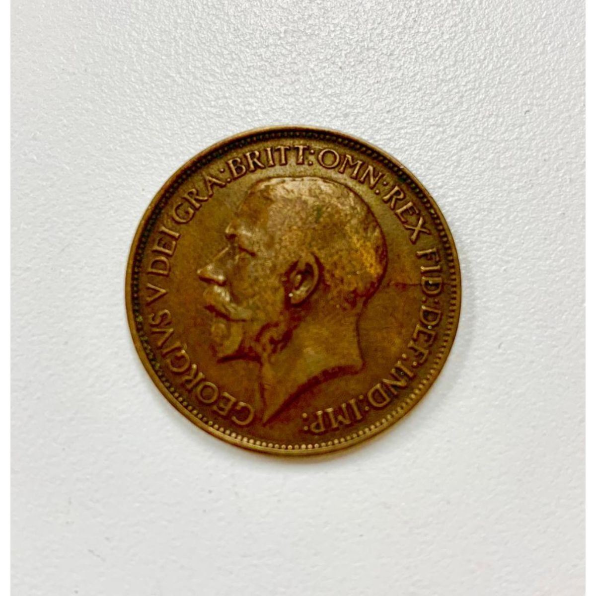 Obverse Uncrowned portrait of King George V facing left, legend around. Lettering: GEORGIVS V DEI GRA:BRITT:OMN:REX FID:DEF:IND:IMP Translation: George the Fifth by the Grace of God King of all the Britains Defender of the Faith Emperor of India Engraver: Edgar Bertram MacKennal Reverse Seated figure of Britannia right, trident in left hand, shield bearing the Union flag in right, denomination around, date in exergue, sea behind Lettering: HALF PENNY 1919 Engraver: Leonard Charles Wyon Edge Plain Specifications Country: United Kingdom King: George V (1910-1936) Type: Standard circulation coin Years: 1911-1925 Value: 1/2 Penny = 1/24 Shilling (1/480) Currency: Pound sterling (1158-1970) Composition: Bronze Weight: 5.67 g Diameter: 25.5 mm Thickness: 1.28 mm Shape: Round