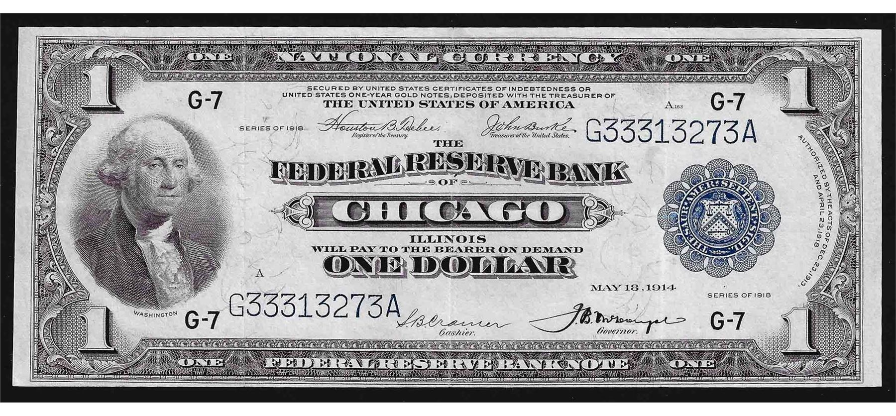 One 1919 $1 Federal Reserve Bank of Chicago National Currency Note.