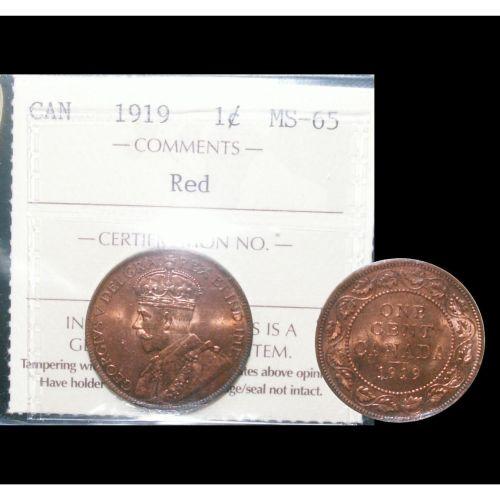 1919 1¢ ICCS MS65RD, a gem example with light rim tone.