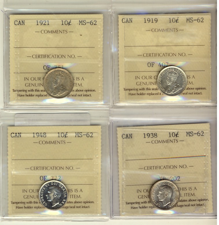 1919 10¢, 1921, 1938 & 1948ICCS MS62. Lot of 4 coins.