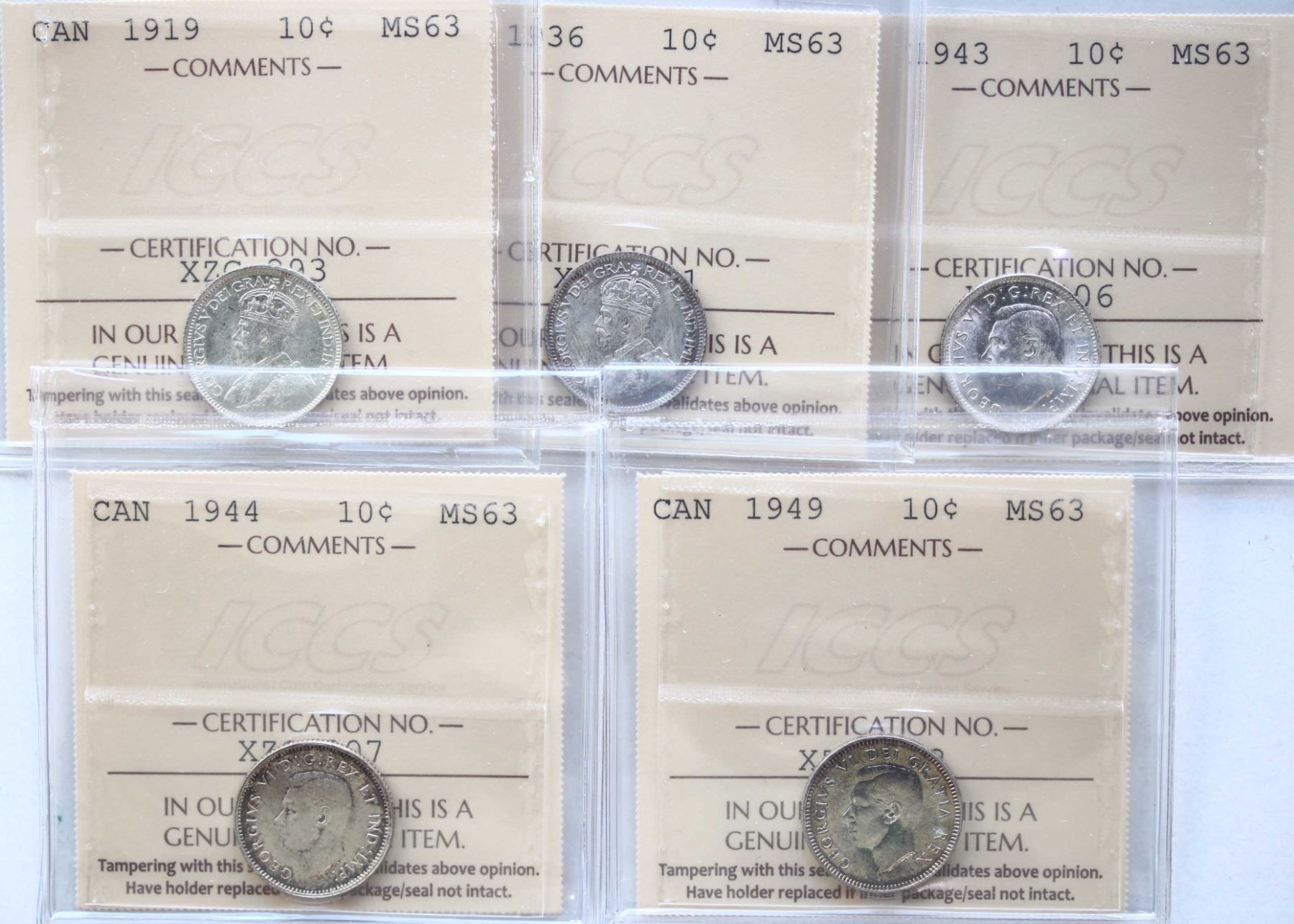 1919 10¢, 1936, 1943, 1944, 1949, All 5 coins ICCS Choice Mint State-63.
