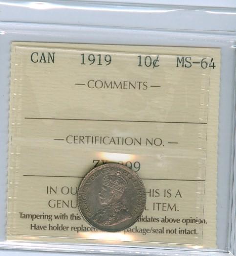 1919 10¢ ICCS MS-64 PQ+. Intense autumn shades over full underlying luster. Wow!