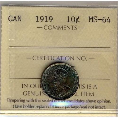 1919 10¢ ICCS MS64. Toned with shades of blue and brown.
