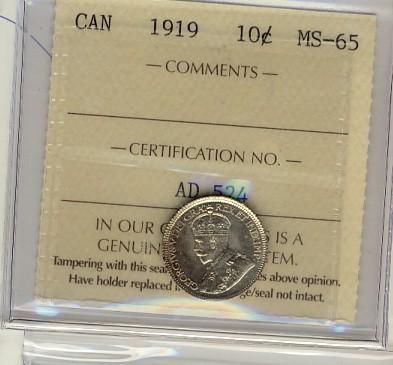 1919 10¢ ICCS MS65. Flashy well struck example.