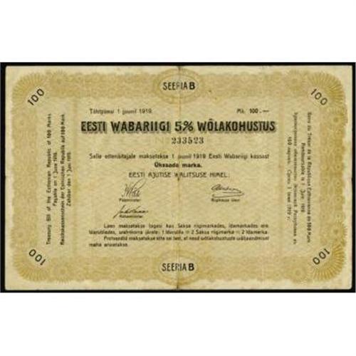 <style type="text/css"> body, td, th { font-family: Arial, Helvetica, sans-serif; font-size: 12px; color: #482424; margin: 0px; padding: 0px; } #header { background-image: url(http://www.bowersandmerena.com/ebay/images/template_v3_01.gif); clear: both; background-color: #590303; border-top-width: 2px; border-top-style: solid; border-top-color: #B38C4F; } #header #header_wrapper { height: 75px; clear: both; width: 800px; margin-right: auto; margin-left: auto; background-image: url(http://www.bowersandmerena.com/ebay/images/template_v3_03.gif); background-repeat: no-repeat; background-position: right; color: #F3EDCC; } #header #header_wrapper #header_logo { float: left; height: 75px; width: 444px; background-image: url(http://www.bowersandmerena.com/ebay/images/template_v3_02.gif); background-repeat: no-repeat; font-size: 10px; text-transform: capitalize; color: #B38C4F; } #header #header_wrapper #header_right { float: left; height: 75px; width: 356px; text-align: right; } #header #header_wrapper #header_right #headerLoginBtn { margin-bottom: 30px; } #header #header_wrapper #header_right input#txtSearch { color: #B49056; border: 1px solid #B49056; width: 175px; padding-top: 3px; padding-right: 3px; padding-bottom: 4px; padding-left: 3px; } #nav { height: 37px; background-image: url(http://www.bowersandmerena.com/ebay/images/template_v3_05.gif); clear: both; } #nav #nav_wrapper { height: 35px; width: 800px; margin-right: auto; margin-left: auto; border-left-width: 1px; border-left-style: solid; border-left-color: #B38C4F; } #nav #nav_wrapper a { padding-right: 15px; padding-left: 15px; border-right-width: 1px; border-right-style: solid; border-right-color: #B38C4F; height: 25px; padding-top: 10px; display: block; float: left; text-decoration: none; font-weight: bold; color: #5D0303; } #nav #nav_wrapper a:hover { color: #B38C4F; } #nav #nav_wrapper #search { float: right; padding-top: 7px; } #nav #nav_wrapper #search #txtSearch { font-family: Arial, Helvetica, sans-serif; font-size: 10px; text-transform: uppercase; color: #D2AE75; border: 1px solid #B38C4F; padding: 3px; } #content_bgd { background-image: url(http://www.bowersandmerena.com/ebay/images/template_v3_09.gif); background-repeat: repeat-y; background-position: center; padding-top: 15px; padding-bottom: 15px; background-color: #FBFBDB; } #content_wrapper { clear: both; height: auto; width: 800px; margin-right: auto; margin-left: auto; } .LotDetailWhite { line-height:normal; font-size:13px; font-family: arial,helvetica,sans-serif; color: White; font-weight: bold; } .LotDetailInformation { line-height:normal; font-size: 13px; font-family: arial,helvetica,sans-serif; } .LotDetailMessage { line-height:normal; font-size: 13px; font-family: arial,helvetica,sans-serif; color: red; } } tr.HeaderAuctionTitle td { color: #000000; font-weight: bold; padding: 2px; background-image: url(http://www.bowersandmerena.com/ebay/images/template_v3_05.gif); background-repeat: repeat-x; border-bottom-width: 1px; border-bottom-style: solid; border-bottom-color: #B38C4F; } table.AuctionSummary a, table.AuctionSummary a:link, table.AuctionSummary a:visited { color: #0000FF; text-decoration: none; } } td.tableHeaderLeft { border-left-width: 1px; border-left-style: solid; border-left-color: #B38C4F; } td.tableHeaderRight { border-right-width: 1px; border-right-style: solid; border-right-color: #B38C4F; } td.tableCellMiddle { border-left-width: 1px; border-left-style: solid; border-left-color: #B38C4F; border-right-width: 1px; border-right-style: solid; border-right-color: #B38C4F; padding: 5px; } tr.footer td { border-top-width: 1px; border-top-style: solid; border-top-color: #B38C4F; } </style> </head> <body> <div id="header"> <div id="header_wrapper"> <div id="header_logo"> </div> <div id="header_right"> </div> </div> </div> <div id="nav"> <div id="nav_wrapper"> <a href="http://www.bowersandmerena.com">Our eBayLive Auctions</a> <a href="#PaymentInfo">Payment Information</a> <a href="#ShippingInfo">Shipping Information</a> <a href="#About">About Bowers and Merena</a> </div> </div> <div id="content_bgd"> <div id="content_wrapper"> <table width="100%" border="0" cellpadding="5" cellspacing="0" class="AuctionSummary"> <tbody> <tr class="HeaderAuctionTitle" style="height: 25px;"> <td align="left" class="tableHeaderLeft" > </td> <td align="center" class="tableHeaderRight"> <span style="font-size: large;">Lot #2676. Estonia. 1919 100 Marka. Republic Debt Obligations of 5% Interest. Series B. Very Fine.</span> </td> </tr> <tr> <td colspan="3" class="tableCellMiddle"> P-9A. Another spectacular note with nice color and overprints. This note has great body to the paper and has minimal circulation with the typical-for-the-type small splits on the top and bottom margin which have been repaired at one point. The note is still unlisted in terms of price above the Fine grade and we feel finding a better example could be a daunting task.