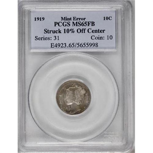 <B>1919 10C Mercury Dime--Off Center--MS65 Full Bands PCGS.</B></I> <BR><BR><B>Coin Engraver:</B> Adolph A. Weinman<BR><BR><b>Shipping:</b> Coins & Currency (<a target="_blank" href="http://www.heritageauctions.com/common/shipping.php">view shipping information</a>)