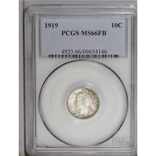 <B>1919<10C> MS66 Full Bands PCGS.</B></I> Mottled apple-green, lemon, and orange-russet colors visit this lustrous and attractively preserved Premium Gem. Well struck save for slight fadeaway on the rims and the tops of nearby letters. Population: 51 in 66, 8 finer (2/06).
