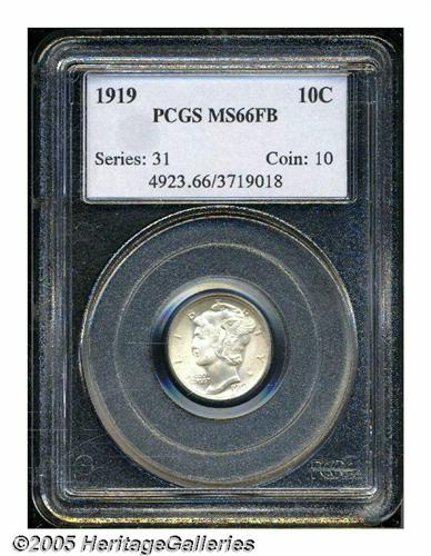 <B>1919<10C> MS66 Full Bands PCGS.</B></I> The bright satiny surfaces are essentially untouched by coin-to-coin contact, and have a coating of creamy pink-gray toning over both sides. An exceptional, eye-pleasing Premium Gem. Population: 41 in 66 Full Bands, 8 finer (6/05).
