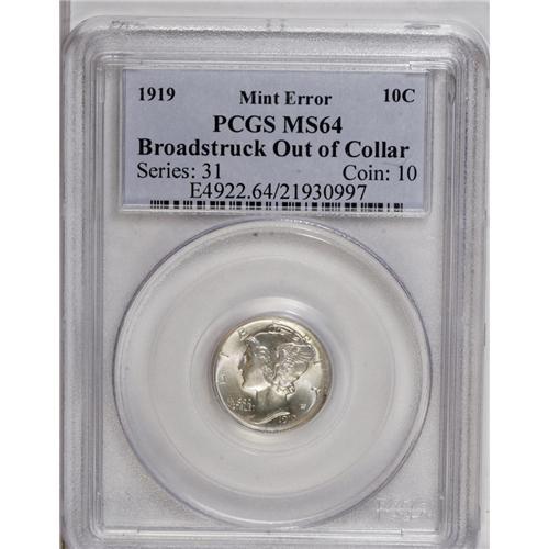 <B>1919<10C> Mercury Dime--Broadstruck Out of Collar--MS64 PCGS.</B></I> An uncentered broadstrike with a broad arc of unstruck surface along the right border. This lustrous near-Gem has a hint of peach patina and (of course) fully split bands. The bottom of the second 9 in the date is incomplete, and the right reverse margin has a few mint-made marks.
