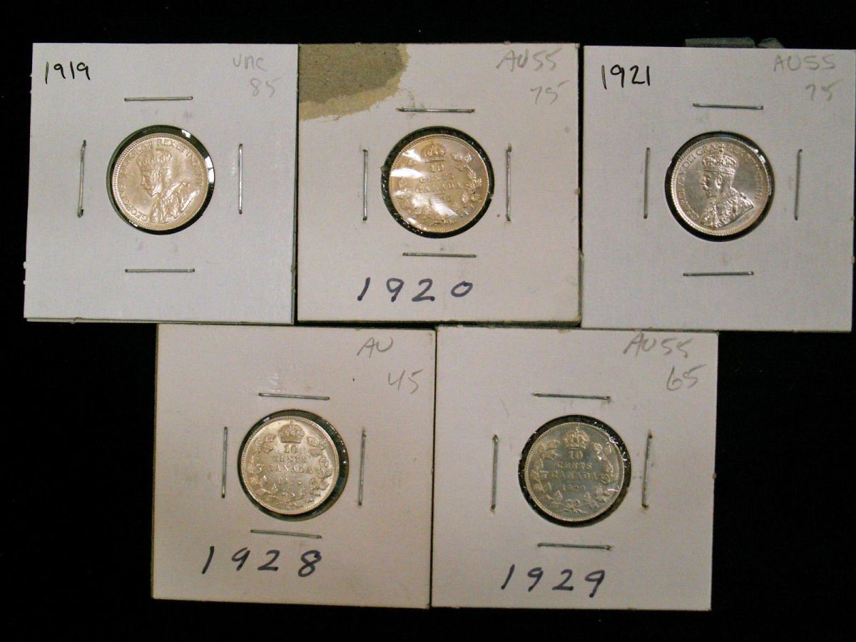 1919, 1920, 1921, 1928 & 1929 10¢. Lot of 5 coins all AU or better and untoned.