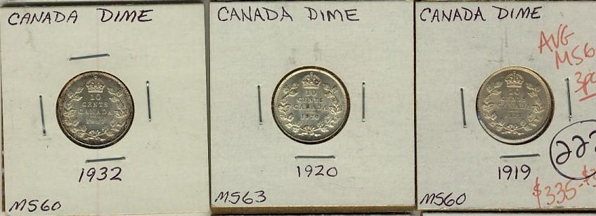 1919, 1920, 1932 10¢, average grades MS62, 3 pieces.