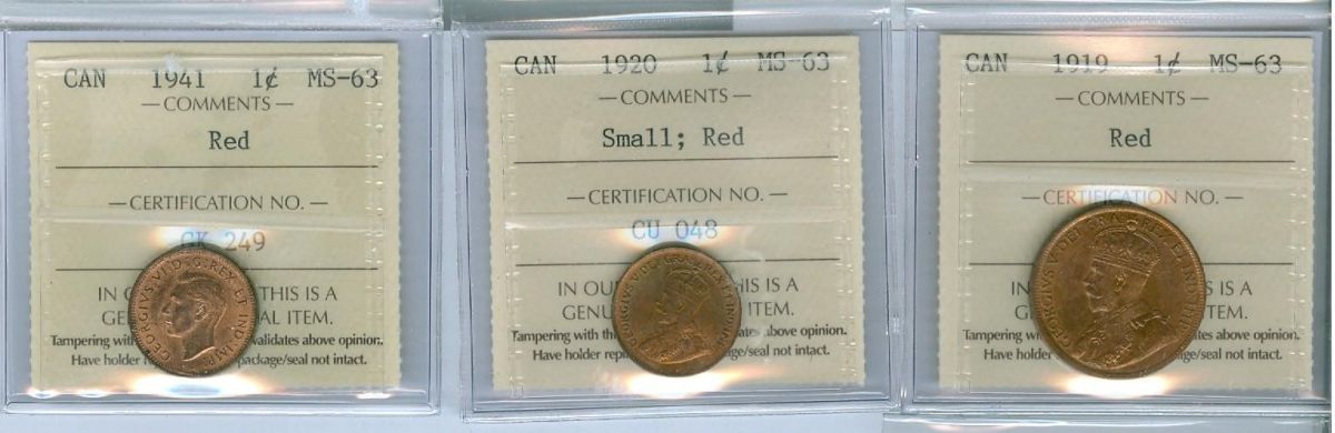1919, 1920 Small and 1941. Lot of 3 ICCS graded 1¢ coins, a