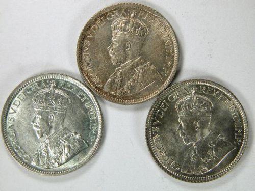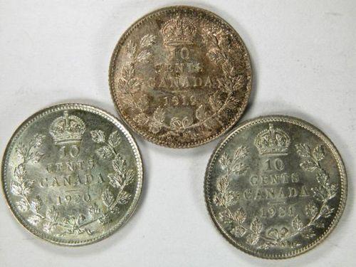 Canada Ten Cents 1919, 1920 and 1921. Three pale toned pieces, all AU and better