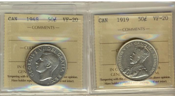 1919 & 1948 50¢ ICCS VF20. Lot of 2 coins.