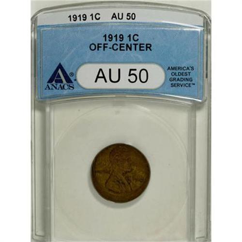<B>1919 1C Cent--Off Center--AU50 ANACS.</B></I> <BR><BR><B>Coin Engraver:</B> Victor D. Brenner<BR><BR><b>Shipping:</b> Coins & Currency (<a target="_blank" href="http://www.heritageauctions.com/common/shipping.php">view shipping information</a>)