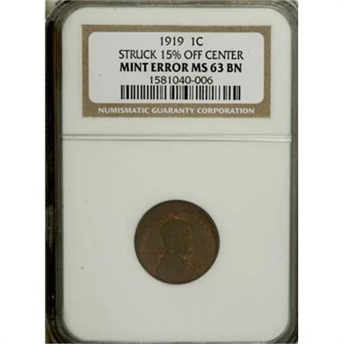 <B>1919 1C Lincoln Cent--Struck 15% Off Center--MS63 Brown NGC.</B></I> <BR><BR><B>Coin Engraver:</B> Victor D. Brenner<BR><BR><b>Shipping:</b> Coins & Currency (<a target="_blank" href="http://www.heritageauctions.com/common/shipping.php">view shipping information</a>)