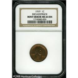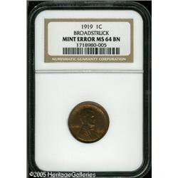 <B>1919 1C Lincoln Cent--Broadstruck--MS64 Brown NGC.</B></I> An uncentered broadstrike that has the widest area of unstruck surface at 1:30. Rich olive and lilac color dominates, although glimpses of original Red are still present. Lot:10841