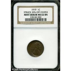 <B>1919 1C Lincoln Cent--Struck 20% Off Center--MS62 NGC.</B></I> Struck nicely off center toward 3:30, the date is complete although much of the right wheat ear is off the flan. Medium brown patina, some mint red color outlines Lincoln's shoulder. A faint obverse diagonal pinscratch is from 10 to 4 o'clock. Lot:10840