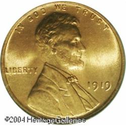 1919 1C MS67 Red PCGS. The 1919 is probably the on <B>1919 1C MS67 Red PCGS.</B></I> The 1919 is probably the only pre-1920 P-mint that is reasonably obtainable in Superb Full Red condition. Even then it is not all that available as only 49 pieces have been graded as such with 15 finer (11/04). This is a spectacular coin that displays bright, full orange mint luster with an occasional dab of light red here and there. Fully struck, there are no obvious or distracting surface blemishes on either side of this impressive coin. <BR><BR><B>Important notice:</B> Heritage usually auctions material at the rate of 200-250 lots per hour. On some occasions eBay Live bid software or the Internet may not be able to keep up with the pace of the auction. We recommend placing a realistic absentee bid now as insurance to avoid disappointment. Occasionally the auctioneer may eliminate or reject an eBay Live bid, and the auctioneer may also reopen a lot after the close of the eBay live bidding (usually because we missed an audience bid), and may reject your bid even if it shows you as the winning bidder. By bidding via eBay Live, you agree that Heritage may award the lot to another bidder at its sole discretion under the circumstances described above or any other reasonable circumstances. Since eBay bids are not shown to us until we open the lot on the floor, we treat those bids just like floor bids. In most cases the floor responds before the eBay bid is presented to us, due to Internet lag time, so for consistency we have made it a policy that floor bids are always considered first over tie eBay live bids. Also please note that all Heritage lots purchased through eBay Live carry a 20% Buyer's Premium. Please make sure you read the Terms and Conditions before you bid. This lot is being auctioned in conjunction with a live floor auction by Heritage Galleries & Auctioneers. All final auction and invoice information will be supplied by Heritage Galleries & Auctioneers, and all other information should be considered preliminary. Lot:5277