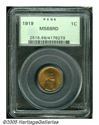 <B>1919<1C> MS68 Red PCGS.</B></I> Brick-red and lime hues grace this highly lustrous and well preserved Superb Gem. Nearly 400 million Cents were struck at Philadelphia in 1919, but circulation, toning, and the passage of time has depleted the quantity of high grade survivors. Certified in a green label holder. Population: 14 in 68, 1 finer (6/05).<BR><I>From The William Bickel Collection, Part One.</B></I>