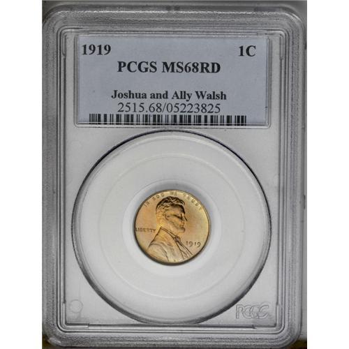 <B>1919<1C> MS68 Red PCGS.</B></I> Ex: Joshua and Ally Walsh Collection. A coin so pristine and mark-free, it resembles a proof in many ways, although it is clearly a business strike. The rims are squared, the surfaces blaze with cartwheel luster, the piece is incredibly mark-free even under strong magnification, and the color is a uniform red with hints of green at the rims. A small carbon speck, visible only with a loupe, in front of Lincoln's bow tie is noted for future pedigree purposes on this incredible coin. Population: 14 in 68, 1 finer (6/06).