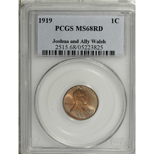 <B>1919 1C MS68 Red PCGS.</B></I> Ex: Joshua and Ally Walsh Collection. A coin so pristine and mark-free, it resembles a proof in many ways, although it is clearly a business strike. The rims are squared, the surfaces blaze with cartwheel luster, the piece is incredibly mark-free even under strong magnification, and the color is a uniform red with hints of green at the rims. A small carbon speck, visible only with a loupe, in front of Lincoln's bow tie is noted for future pedigree purposes on this incredible coin. Population: 14 in 68, 1 finer (12/06).<BR><BR><b>Shipping:</b> Coin/Currency (<a target="_blank" href="http://www.heritageauctions.com/common/shipping.php">view shipping information</a>)