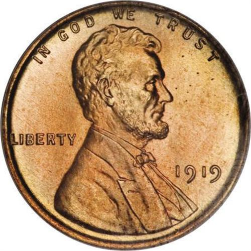 <B>1919 1C MS68 Red PCGS.</B></I> The 1919 is a well-established common date among Lincoln cents, and its abnormally high mintage of over 392 million pieces, combined with extensive saving of the issue in roll quantities, has led to it having the highest population of MS68 survivors of any pre-Memorial issue, according to the PCGS <I>Population Report</B></I>. Unlike a number of other dates of interest to Registry collectors, the 1919 also has a stable population; a Heritage description cites October 1997 population figures that are identical to today's numbers, which are 14 in 68 with one finer (1/08).<BR> The present example offers the magnificent eye appeal one should expect for the MS68 designation. Pale straw-gold margins cede to copper-orange on the obverse and peach on the reverse. Crisp definition and immaculate surfaces complete the impression of virtual perfection.<BR><BR><B>Coin Engraver:</B> Victor D. Brenner<BR><BR><b>Shipping:</b> Coins & Currency (<a target="_blank" href="http://www.heritageauctions.com/common/shipping.php">view shipping information</a>)